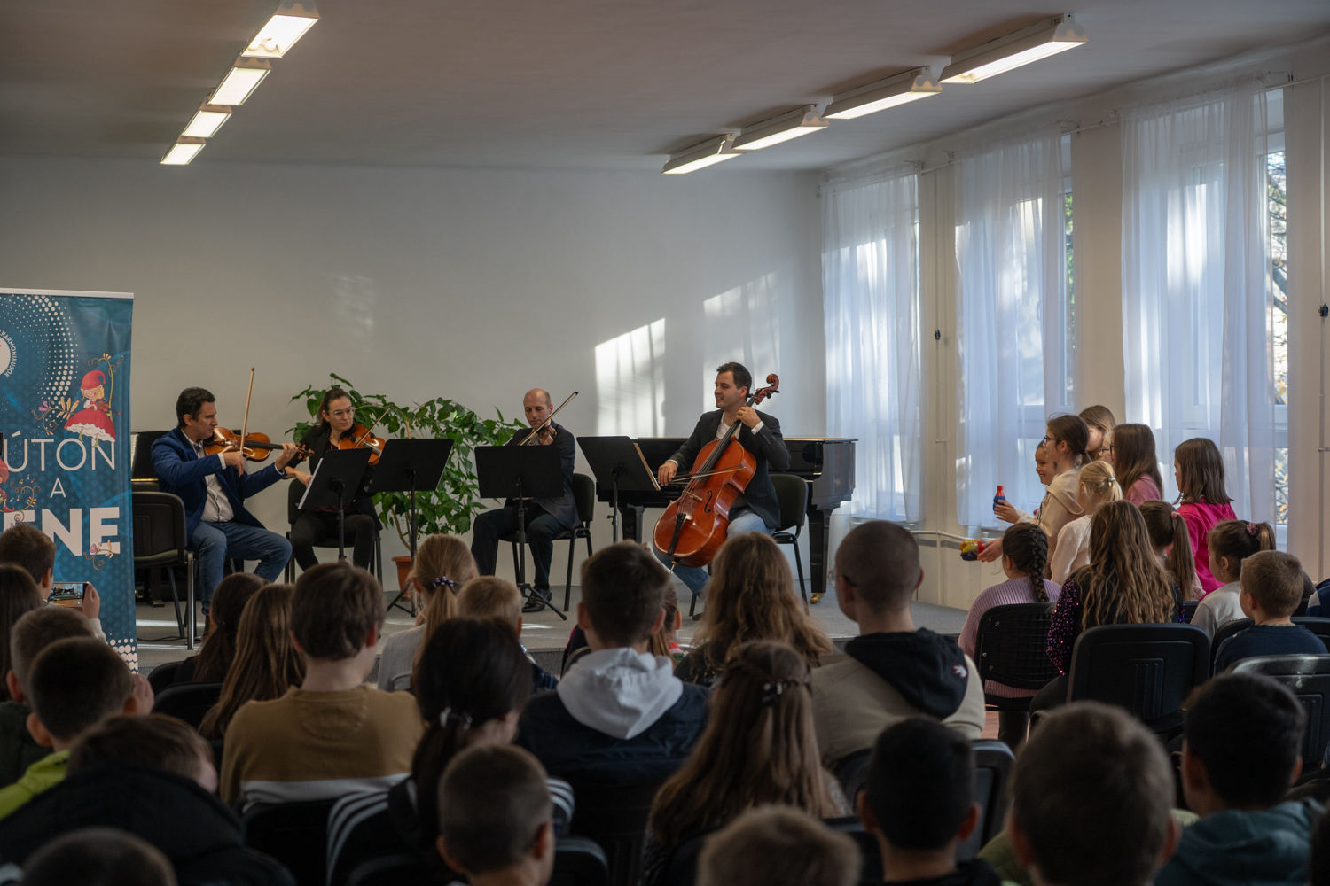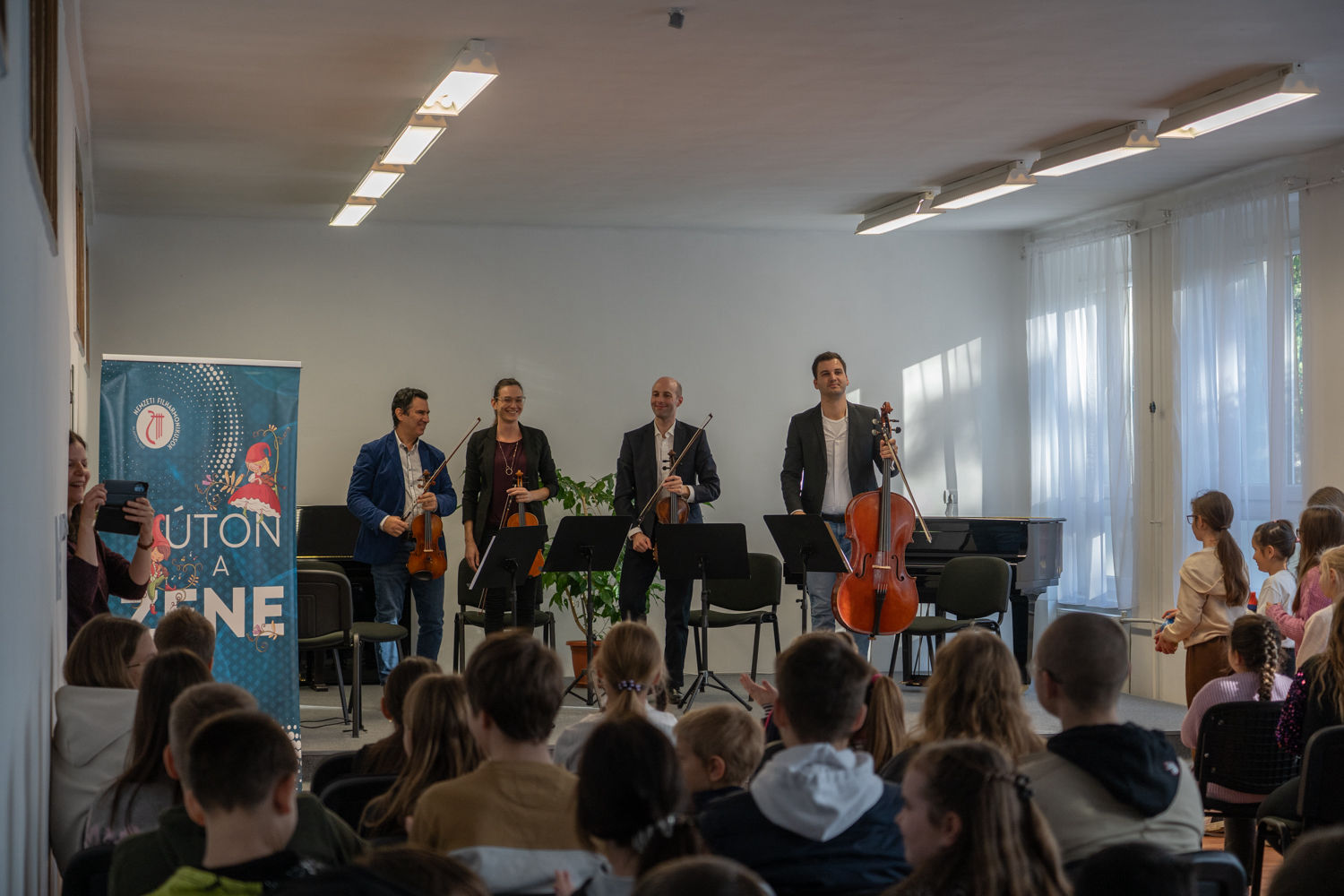„Úton a zene” címmel interaktív ismeretterjesztő kamarakoncerten vehettek részt 2025. november 5-én iskolánk tanulói, melyen a Nemzeti Filharmonikus Zenekar kiváló művészeiből álló vonósnégyes lépett fel. A rendhagyó énekórán közkedvelt dallamokat, valamint sok érdekességet hallhatunk a tánczene fejlődéséről a barokktól a mai slágerekig.