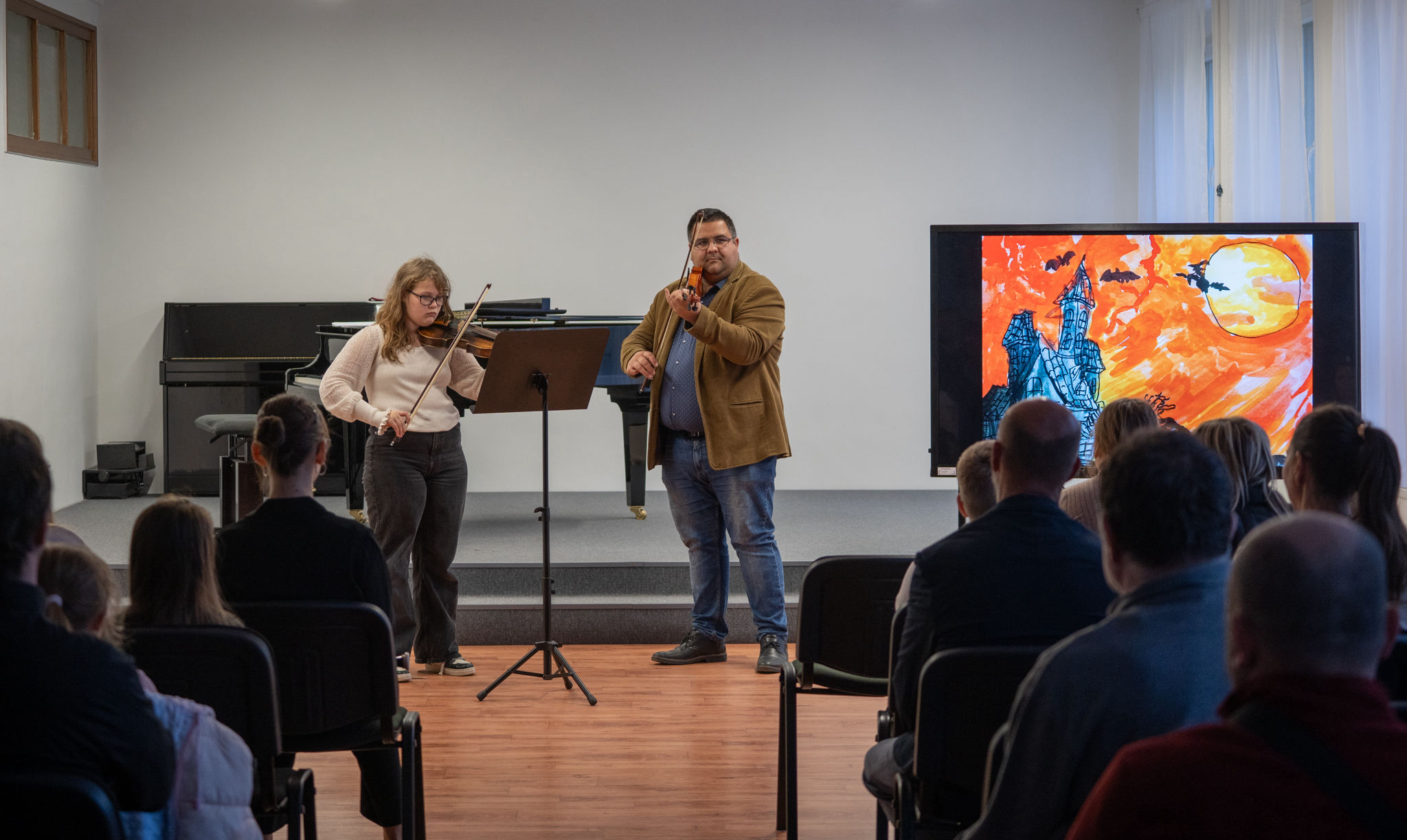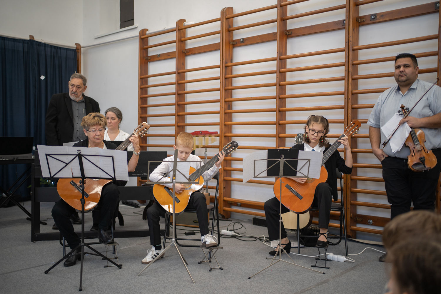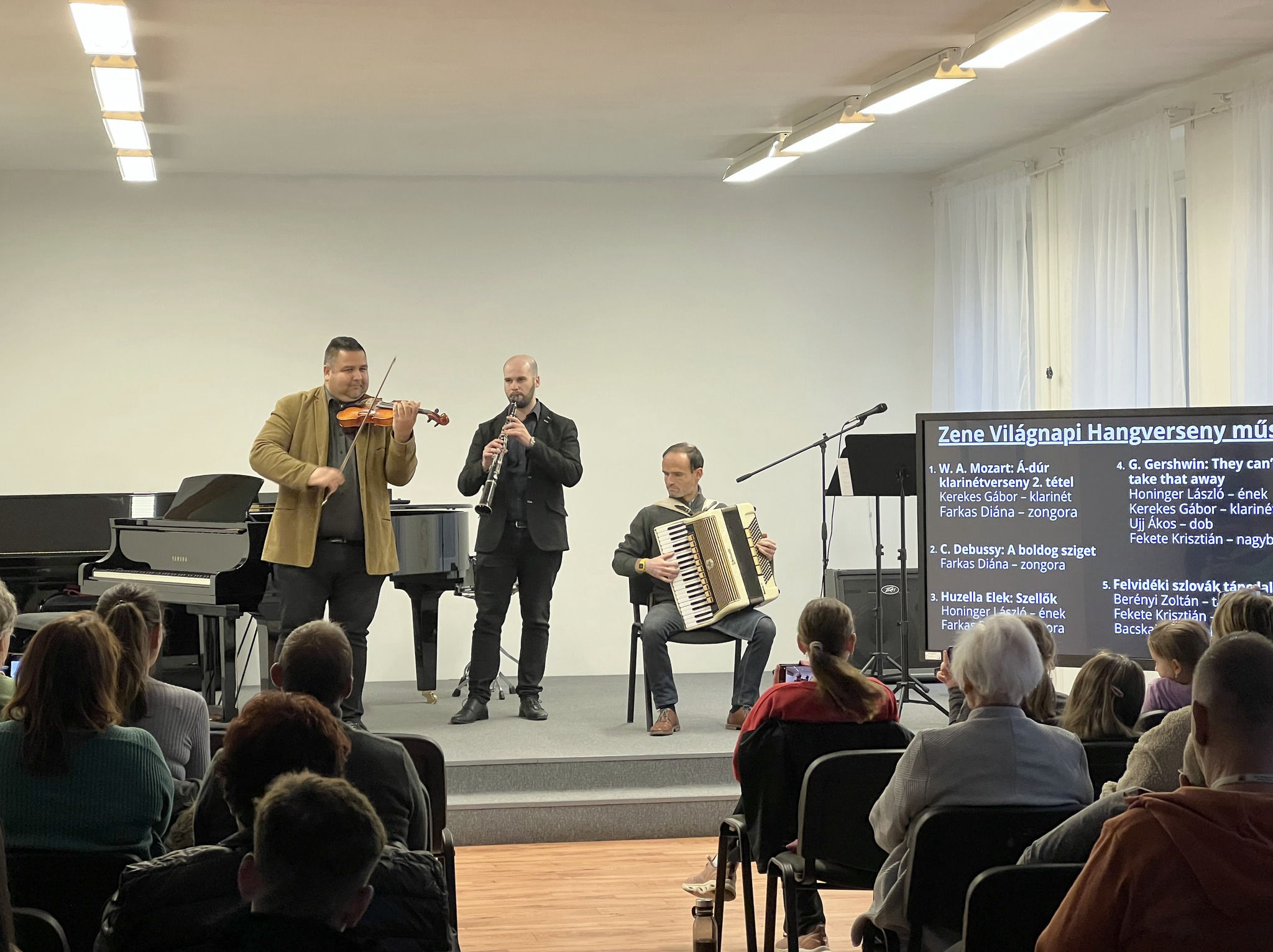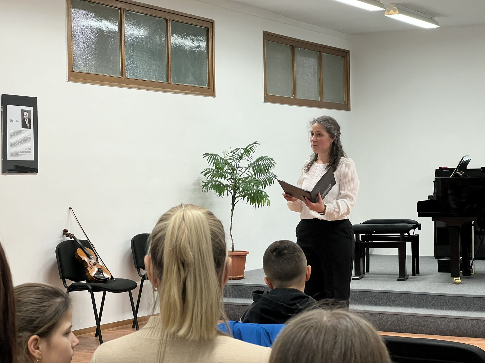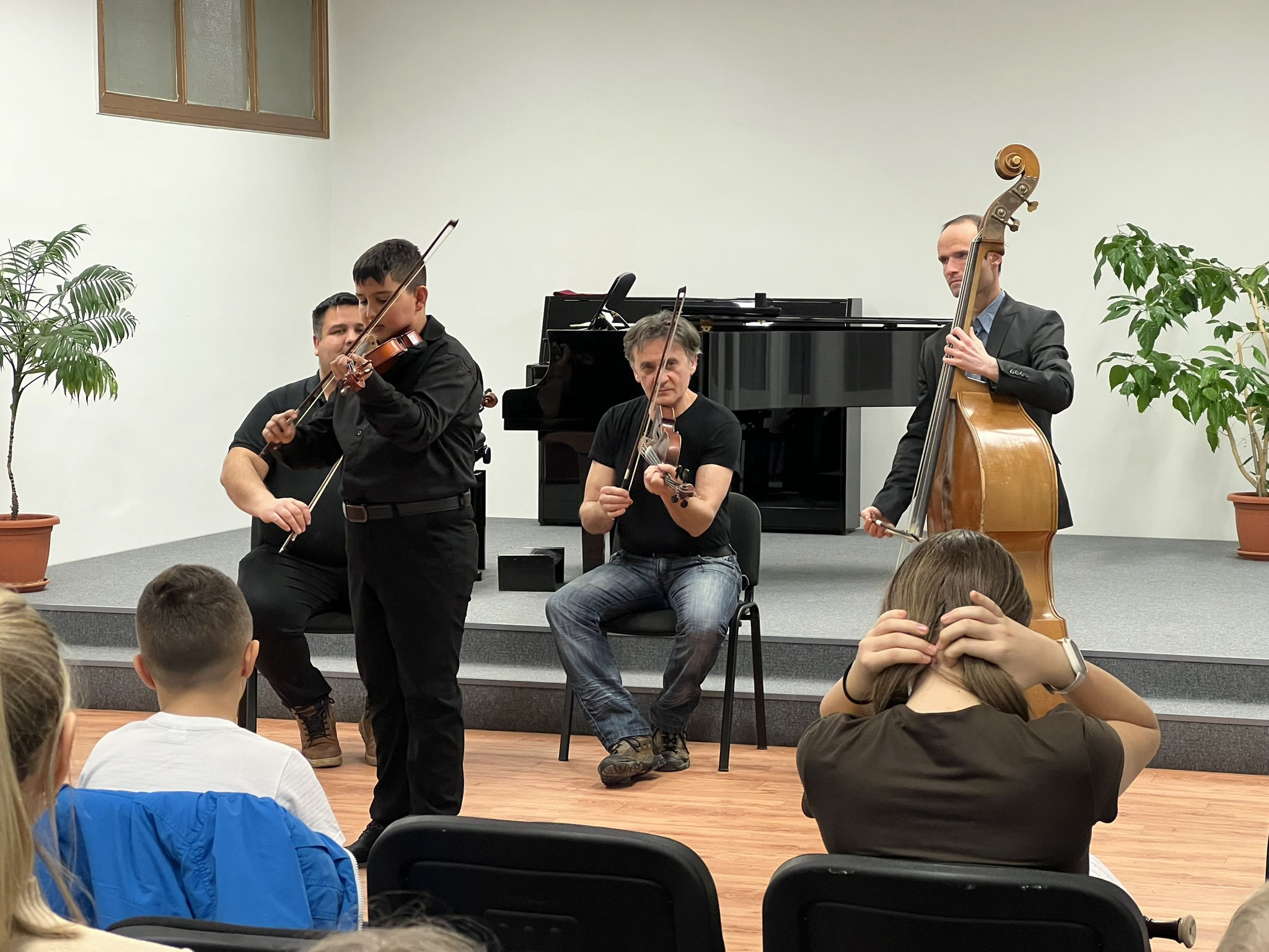 „Úton a zene” címmel interaktív ismeretterjesztő kamarakoncerten vehettek részt 2025. november 5-én iskolánk tanulói, melyen a Nemzeti Filharmonikus Zenekar kiváló művészeiből álló vonósnégyes lépett fel. A rendhagyó énekórán közkedvelt dallamokat, valamint sok érdekességet hallhatunk a tánczene fejlődéséről a barokktól a mai slágerekig.