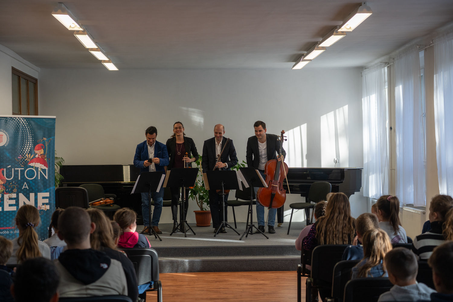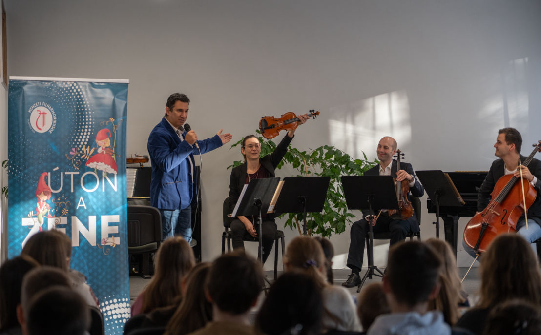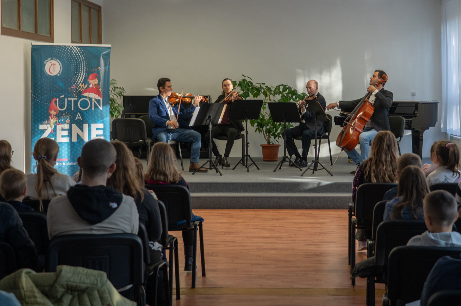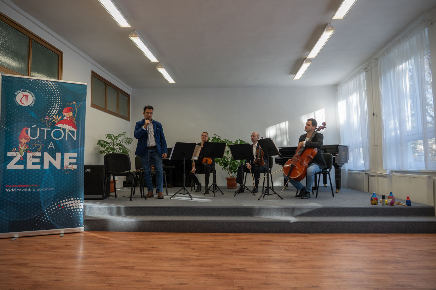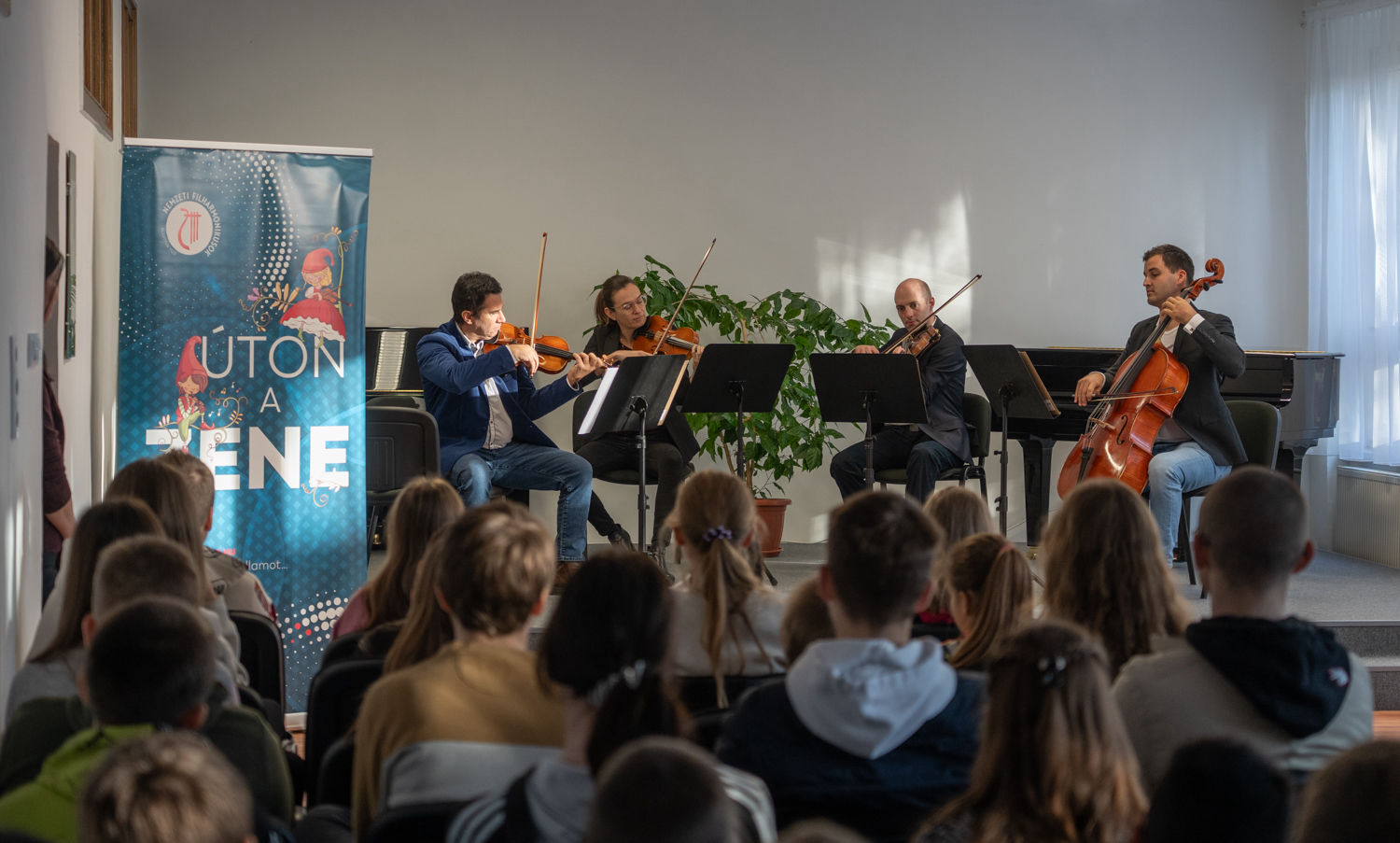 „Úton a zene” címmel interaktív ismeretterjesztő kamarakoncerten vehettek részt 2025. november 5-én iskolánk tanulói, melyen a Nemzeti Filharmonikus Zenekar kiváló művészeiből álló vonósnégyes lépett fel. A rendhagyó énekórán közkedvelt dallamokat, valamint sok érdekességet hallhatunk a tánczene fejlődéséről a barokktól a mai slágerekig.