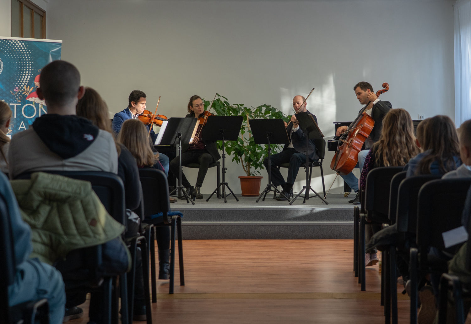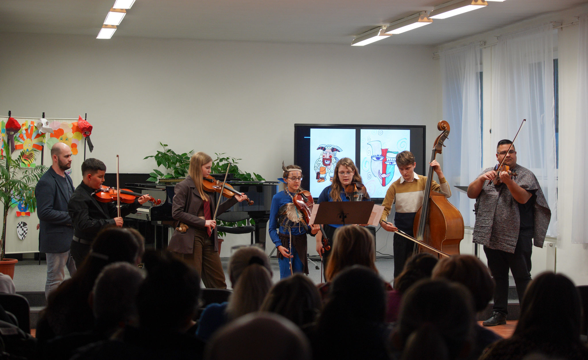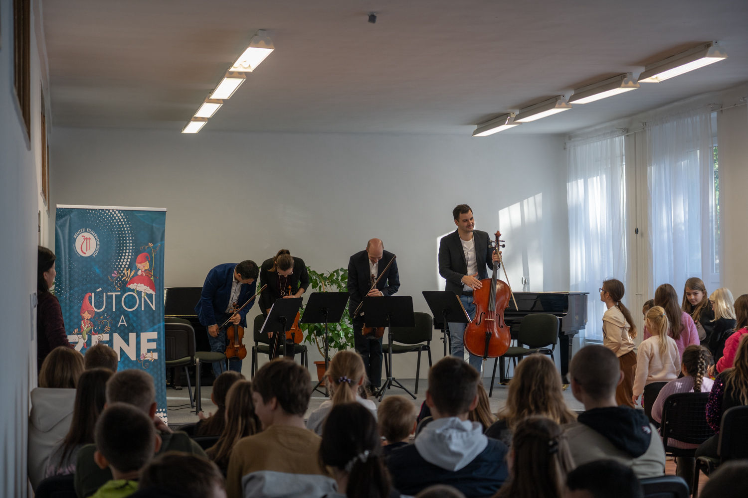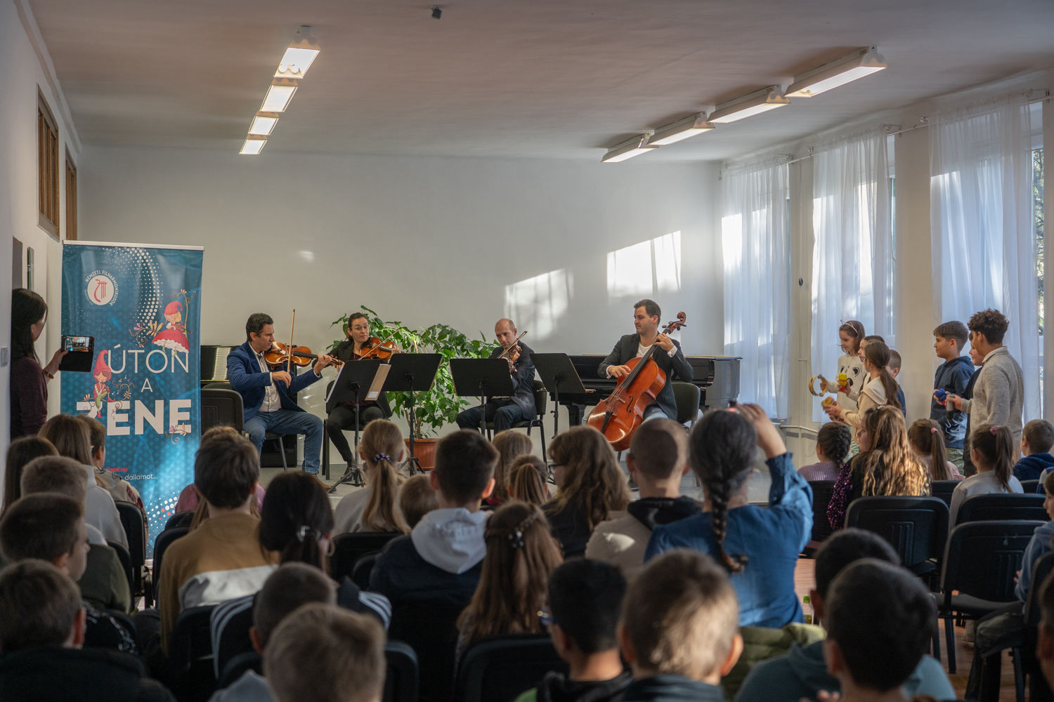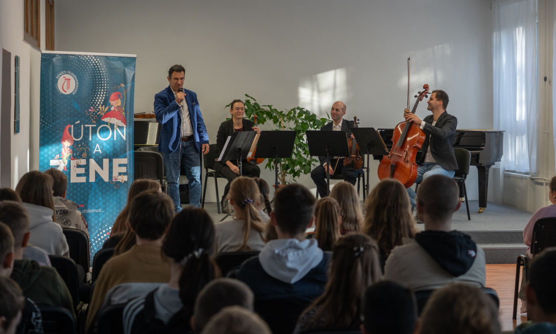 „Úton a zene” címmel interaktív ismeretterjesztő kamarakoncerten vehettek részt 2025. november 5-én iskolánk tanulói, melyen a Nemzeti Filharmonikus Zenekar kiváló művészeiből álló vonósnégyes lépett fel. A rendhagyó énekórán közkedvelt dallamokat, valamint sok érdekességet hallhatunk a tánczene fejlődéséről a barokktól a mai slágerekig.