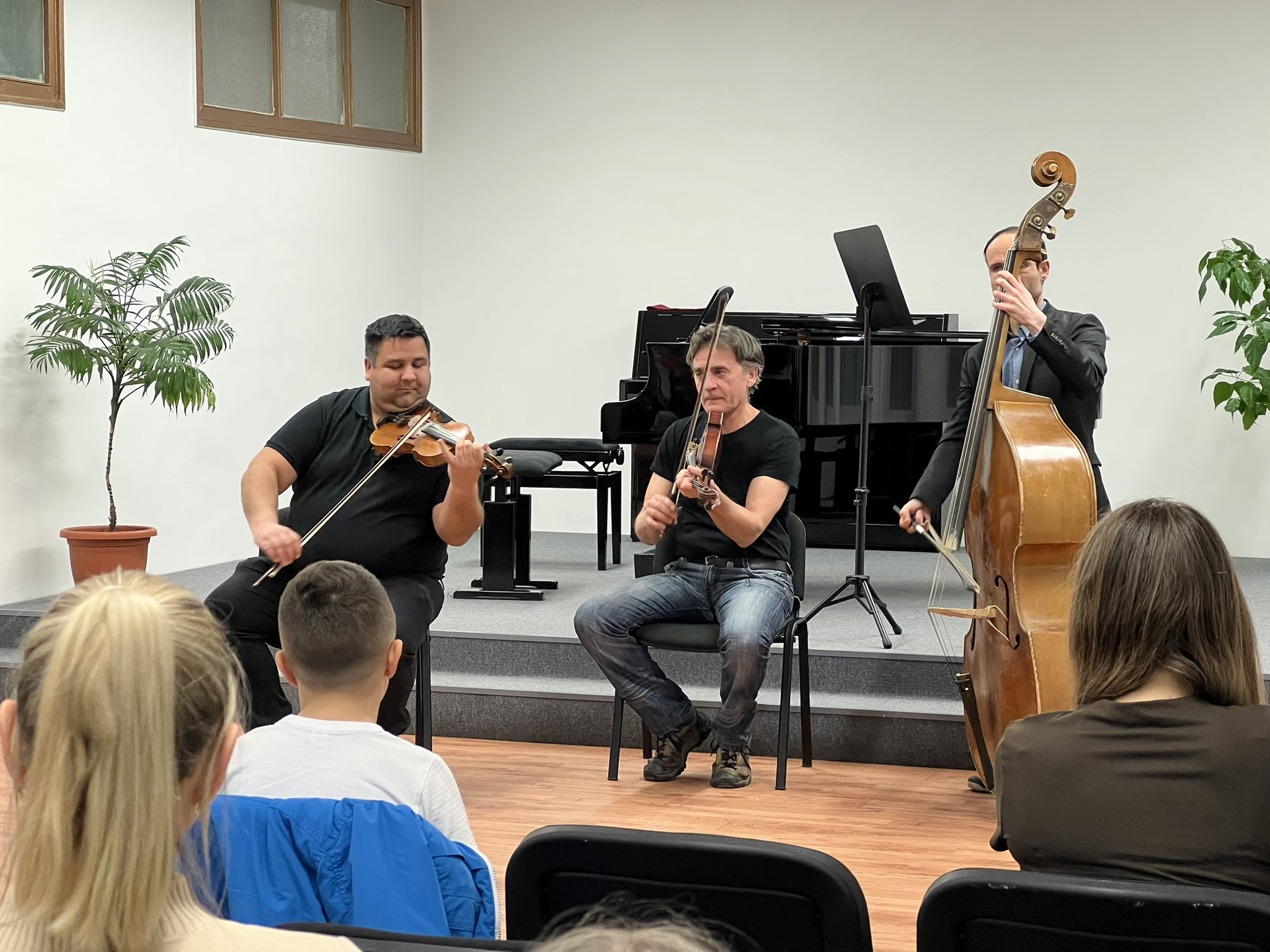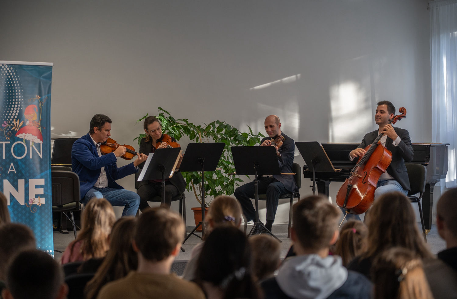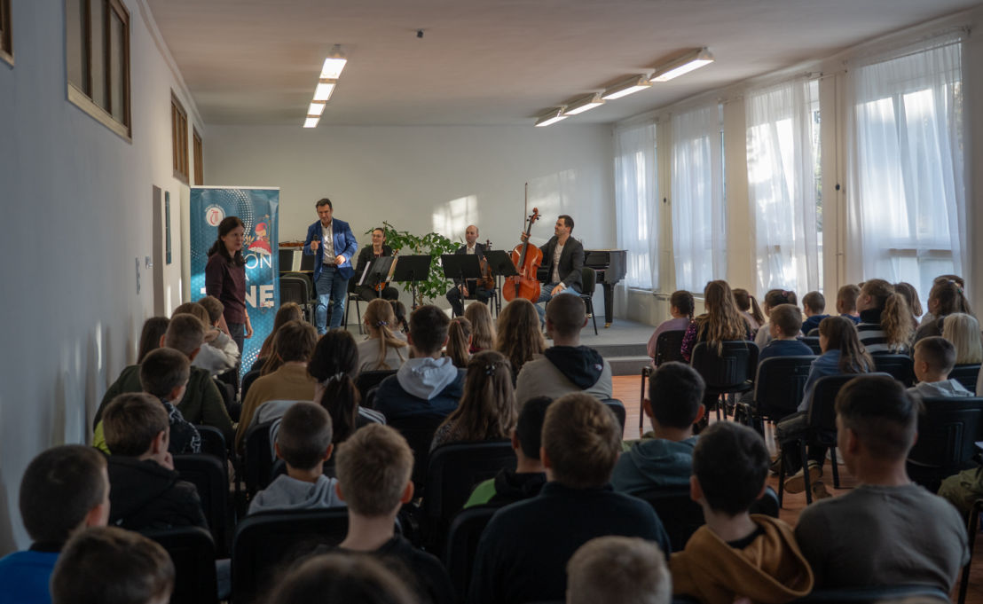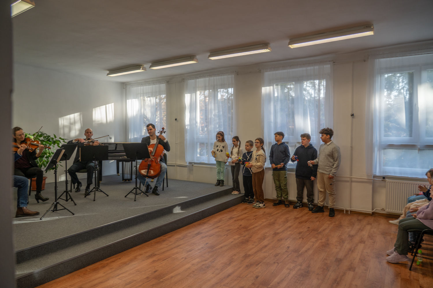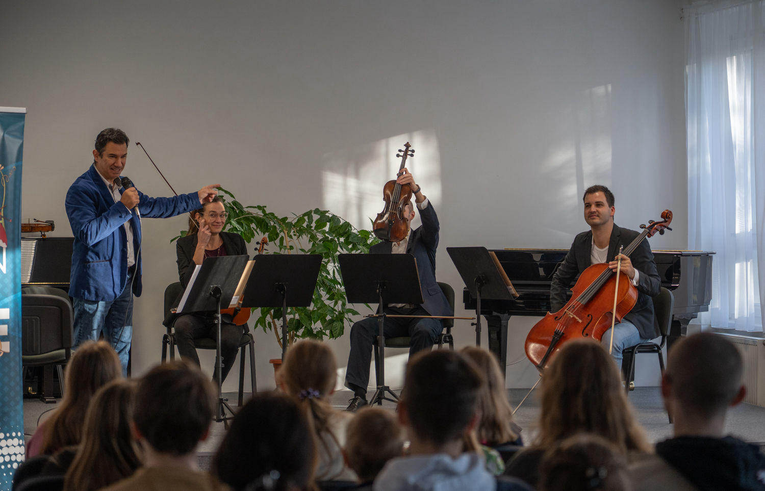 „Úton a zene” címmel interaktív ismeretterjesztő kamarakoncerten vehettek részt 2025. november 5-én iskolánk tanulói, melyen a Nemzeti Filharmonikus Zenekar kiváló művészeiből álló vonósnégyes lépett fel. A rendhagyó énekórán közkedvelt dallamokat, valamint sok érdekességet hallhatunk a tánczene fejlődéséről a barokktól a mai slágerekig.