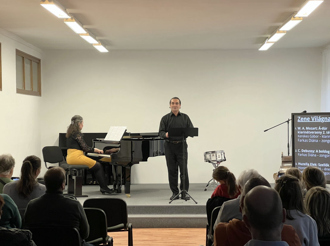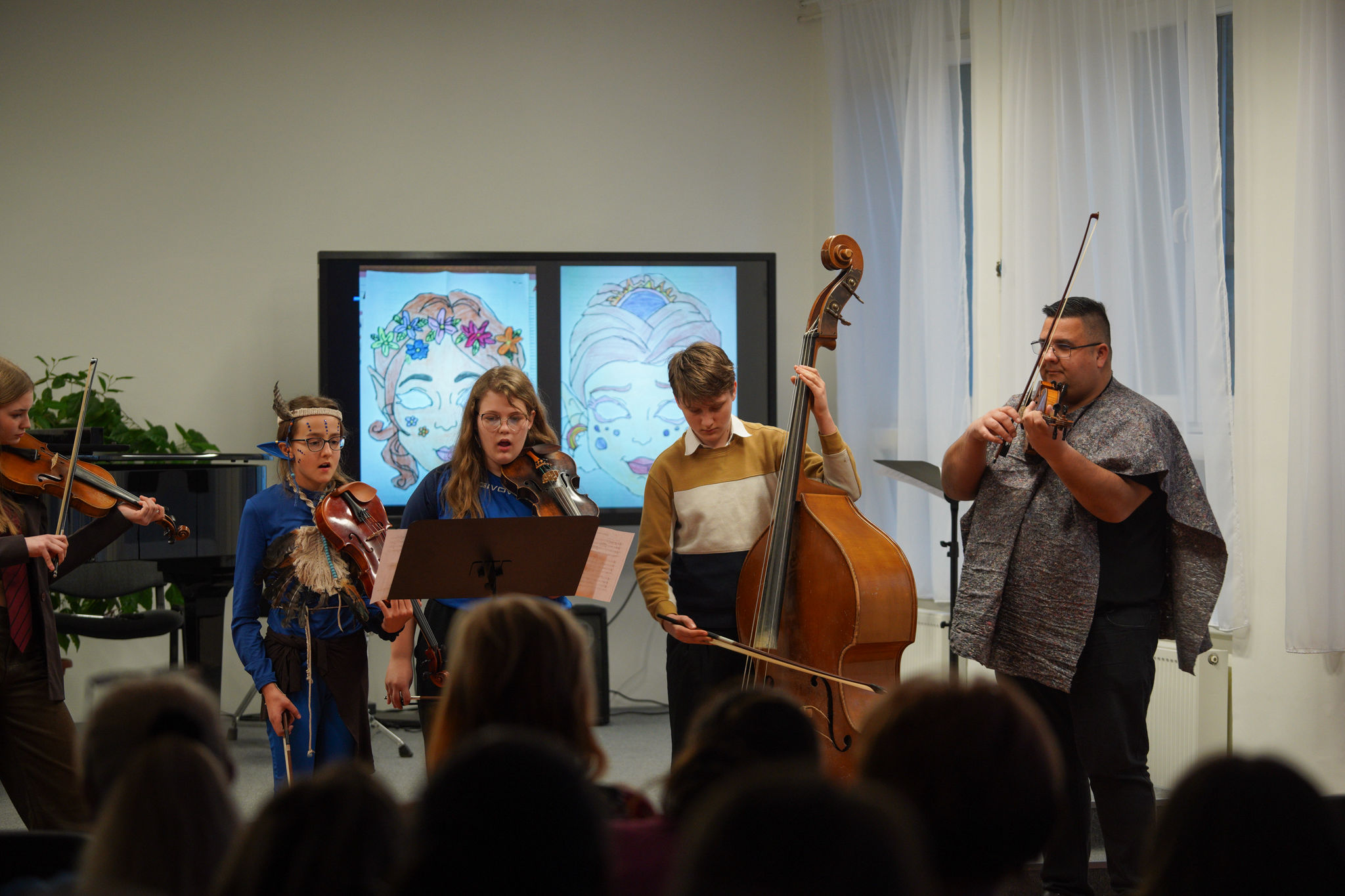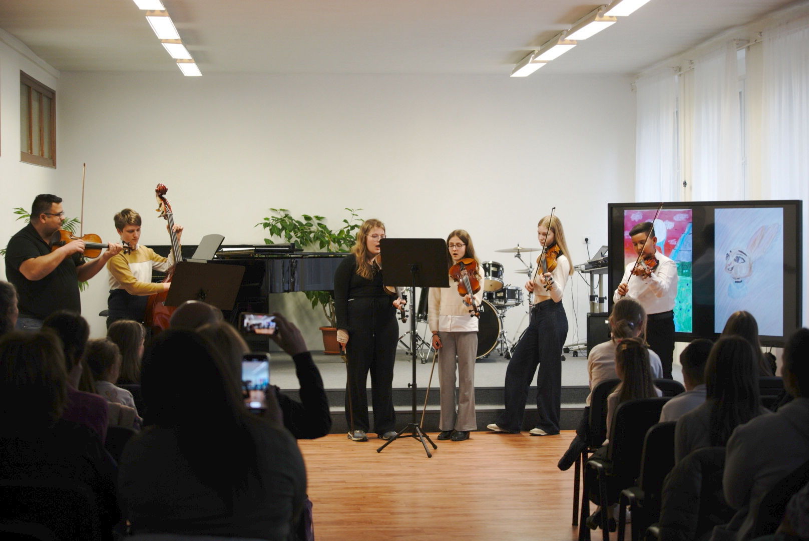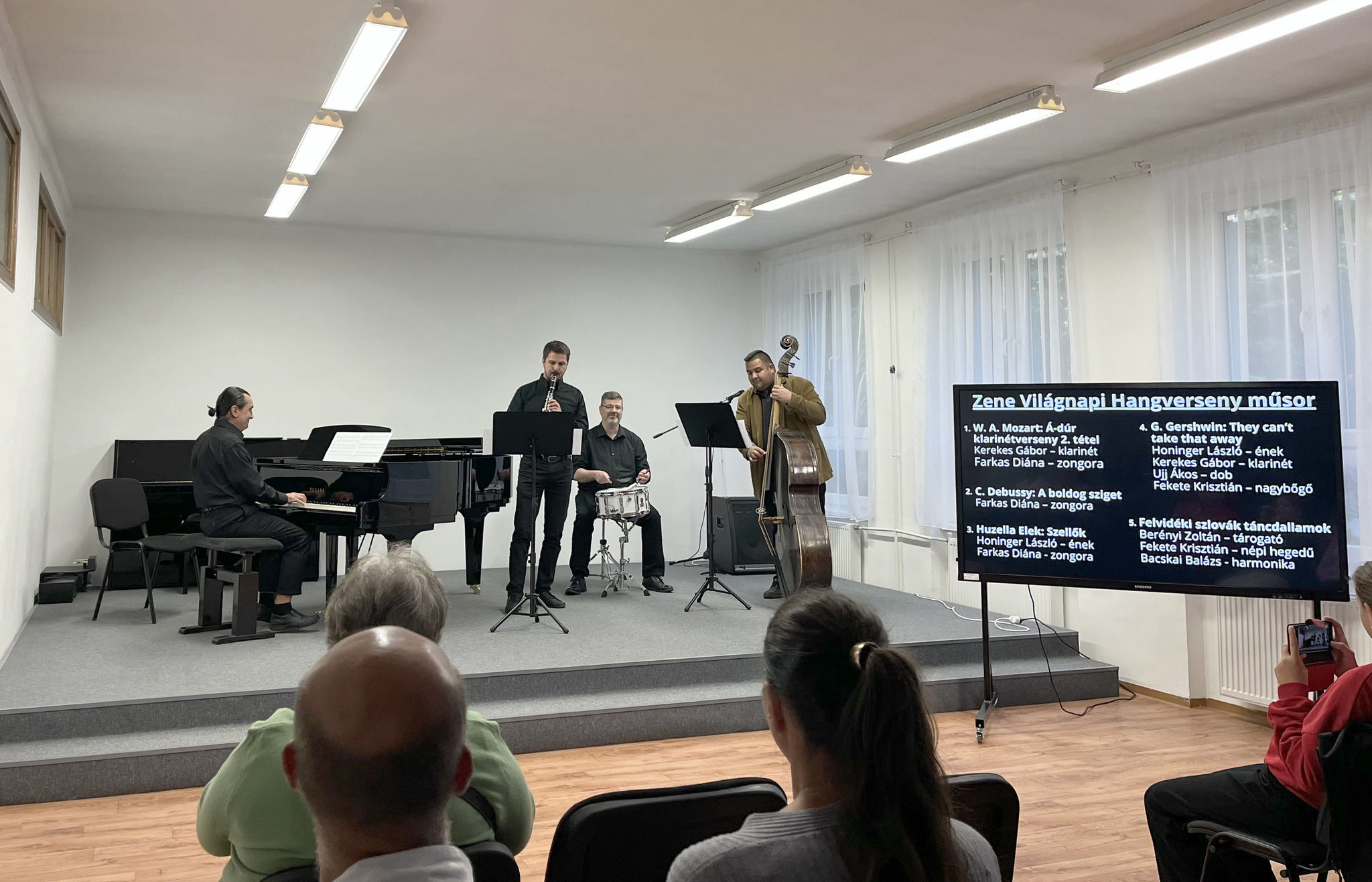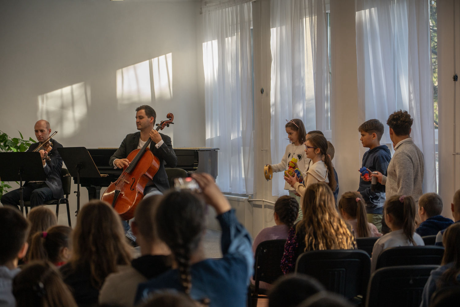 „Úton a zene” címmel interaktív ismeretterjesztő kamarakoncerten vehettek részt 2025. november 5-én iskolánk tanulói, melyen a Nemzeti Filharmonikus Zenekar kiváló művészeiből álló vonósnégyes lépett fel. A rendhagyó énekórán közkedvelt dallamokat, valamint sok érdekességet hallhatunk a tánczene fejlődéséről a barokktól a mai slágerekig.